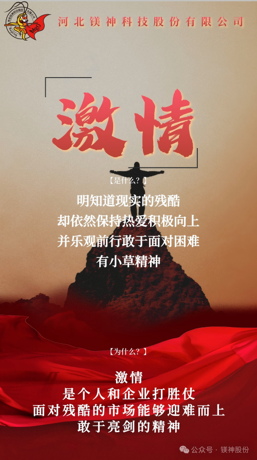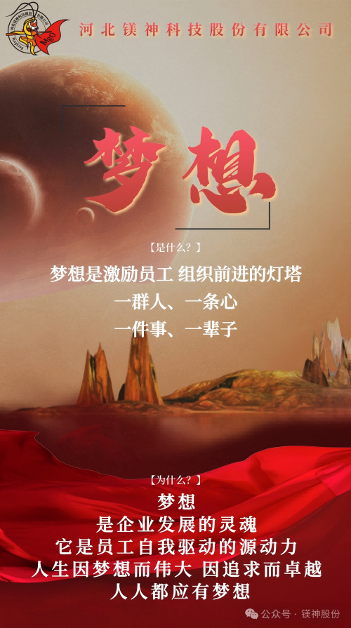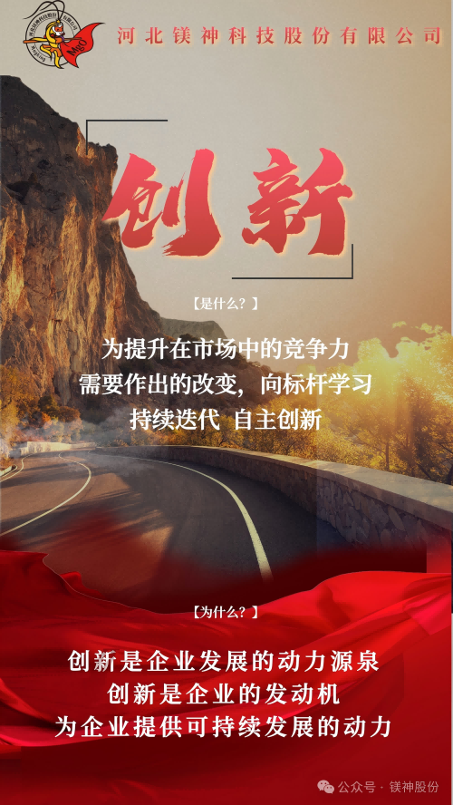 從太行山麓到走向世界舞臺的鎂質新材料領航者,鎂神科技以文化力量開啟新征程。近期,經過全體鎂神人的共創,承載著鎂神人精神基因的企業文化2.0升級版正式發布,同時公眾號將會開展“鎂神人企業文化故事”發布活動,它是指引鎂神人行動的燈塔,是我們凝聚團隊力量,激發創新活力,助力企業騰飛的重要舉措;是我們傳承精神基因,引領行業潮流,邁向世界舞臺的內生動力,是我們對“創建百年鎂神平臺”的堅定信念與承諾。